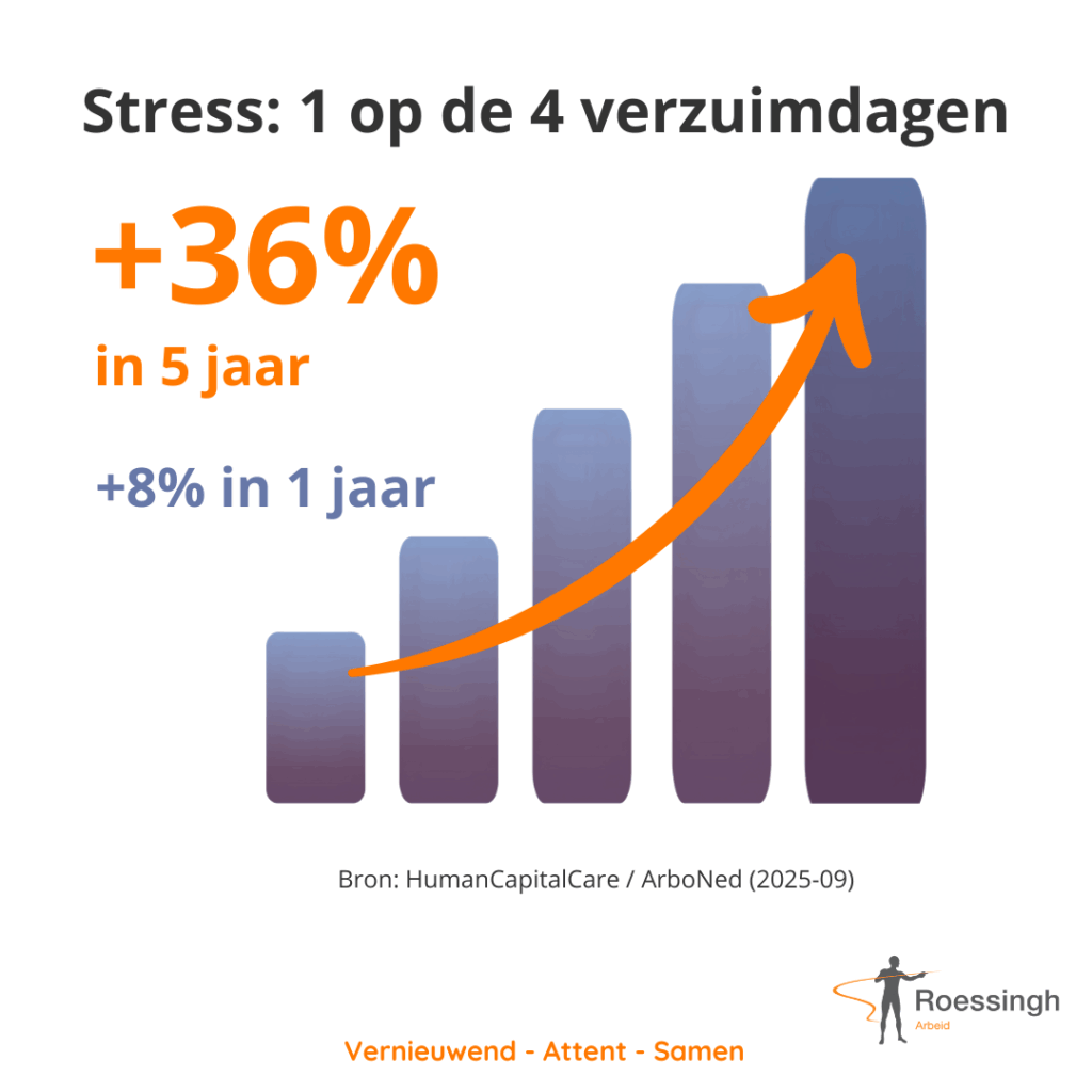 1 op de 4 verzuimdagen heeft inmiddels te maken met stress. Herkenbaar? HumanCapitalCare / ArboNed waarschuwen: verzuim door stress steeg in het afgelopen jaar met 8 %. In vijf jaar tijd zelfs met 36 %. Inmiddels staat 1 op de vier verzuimdagen in verband met stress.👉 Gemiddeld zijn werknemers die uitvallen door stress 252 dagen […]