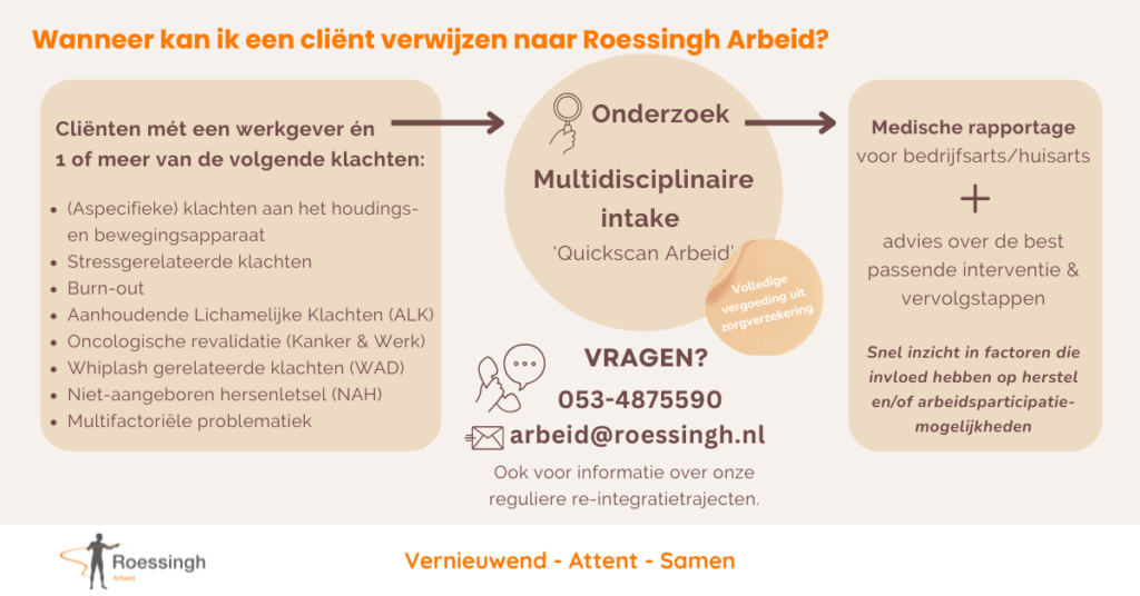 Herken je dit in jouw praktijk of organisatie? Een werknemer met fysieke én psychische klachten die steeds moeilijker kan functioneren op het werk. De medische zorg loopt, maar de werkcontext blijft een belemmerende factor. Wanneer verwijs je dan naar Roessingh Arbeid? Roessingh Arbeid is er voor werknemers die vastlopen in werk door fysieke, psychische of […]