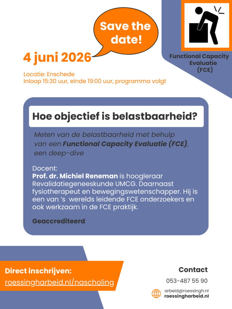 Op 4 juni 2026 organiseert Roessingh Arbeid een geaccrediteerde nascholing voor Bedrijfsartsen, Verzekeringsartsen en Revalidatieartsen over de Functionele Capaciteit Evaluatie (FCE).